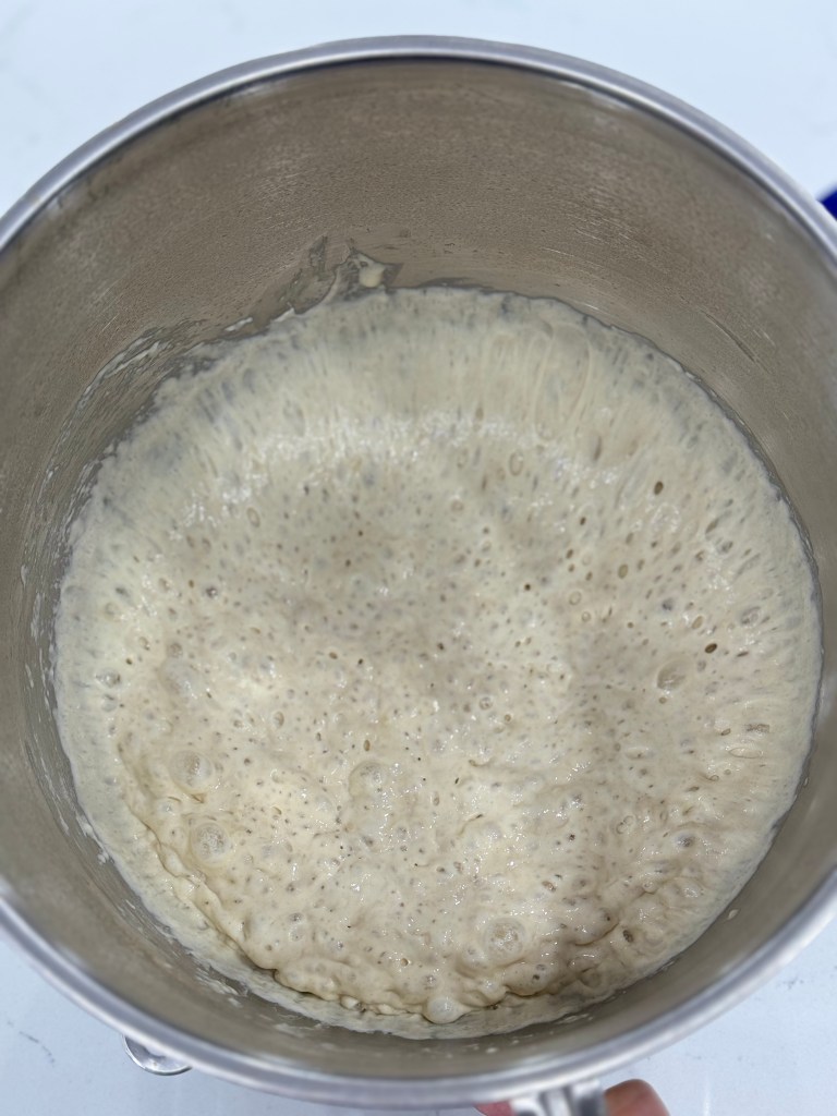 About 12-14 hours later, the poolish should be bubbly and about tripled in volume.