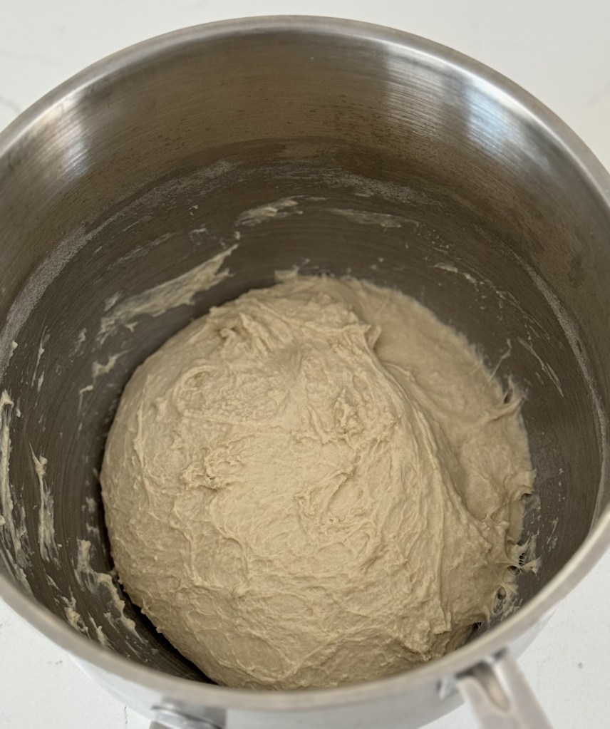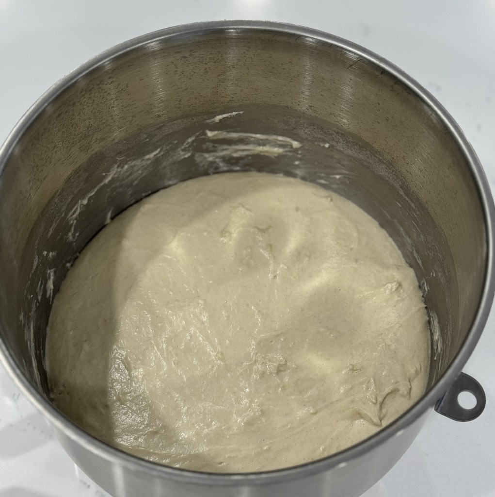 Mix the final dough by adding the additional flour and yeast, then begin incorporating the water while slowly mixing, and add the salt last. Continue mixing for 3-4 minutes then remove the bowl from the mixer and cover it with plastic wrap. The dough will be quite sticky.