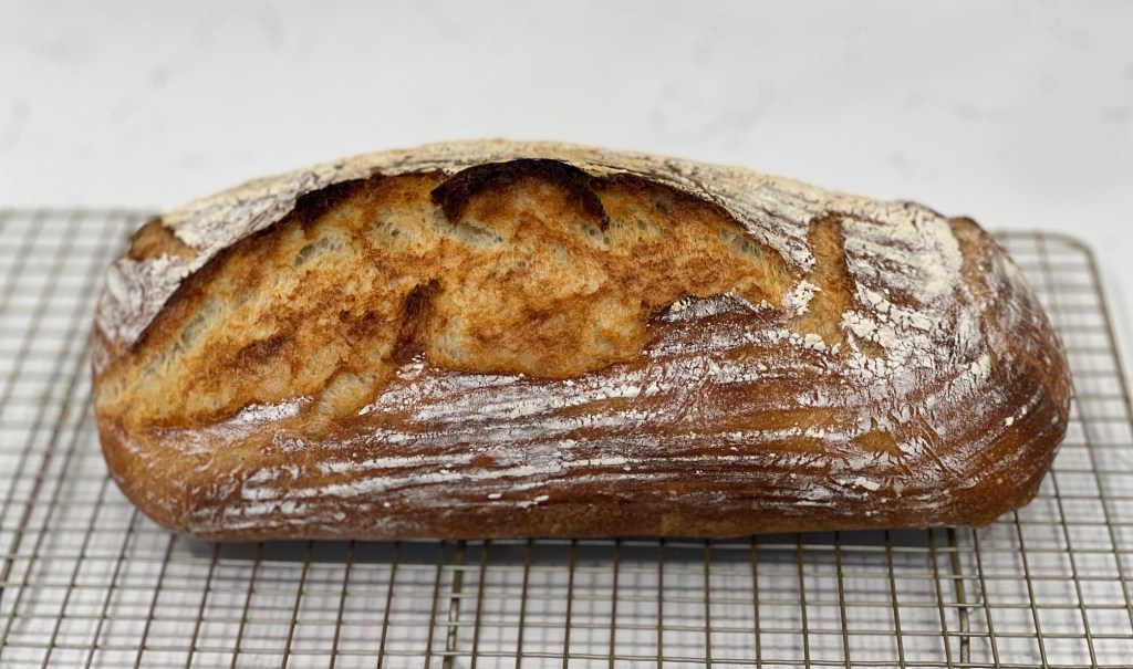 This rustic, crusty bread is delicious when it’s still warm from the oven. The dark crust has an intense flavor and the crumb is soft and chewy.